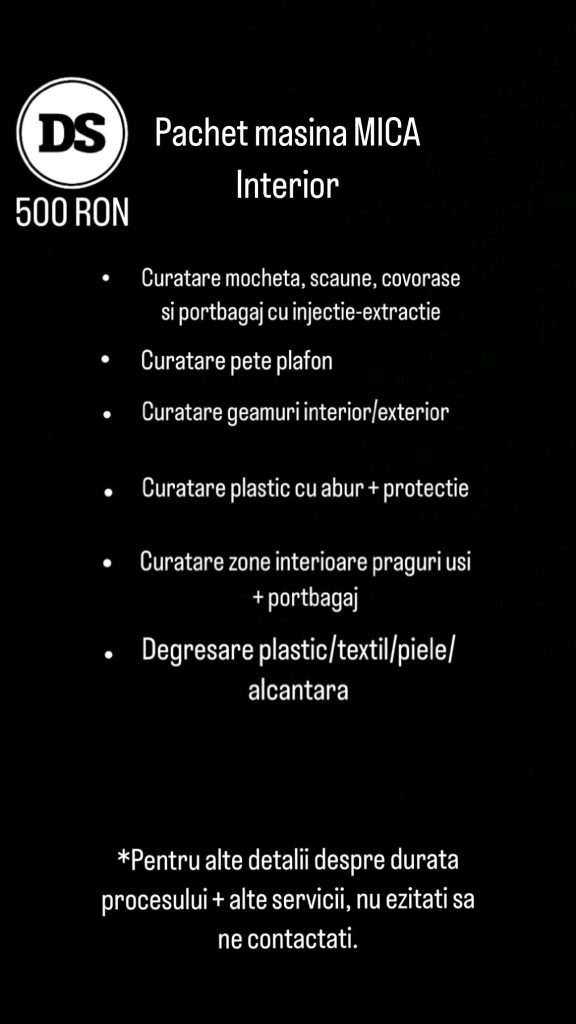 Bine ai venit la The Detail Spot – Expertul tău în detailing auto! Oferim servicii de înaltă calitate pentru vehiculul tău, într-un mod meticulos și profesionist. Echipa noastră pasionată de mașini va revigora aspectul automobilului tău, oferindu-i un luciu impecabil și protecție de durată. Folosim tehnologii avansate și produse de top pentru a ne asigura că obții rezultatele dorite. De la curățarea minuțioasă a interiorului până la detaliile exterioare care strălucesc, suntem dedicați să îți aducem satisfacția maximă. Experimentează o experiență de detailing auto fără egal cu The Detail Spot.